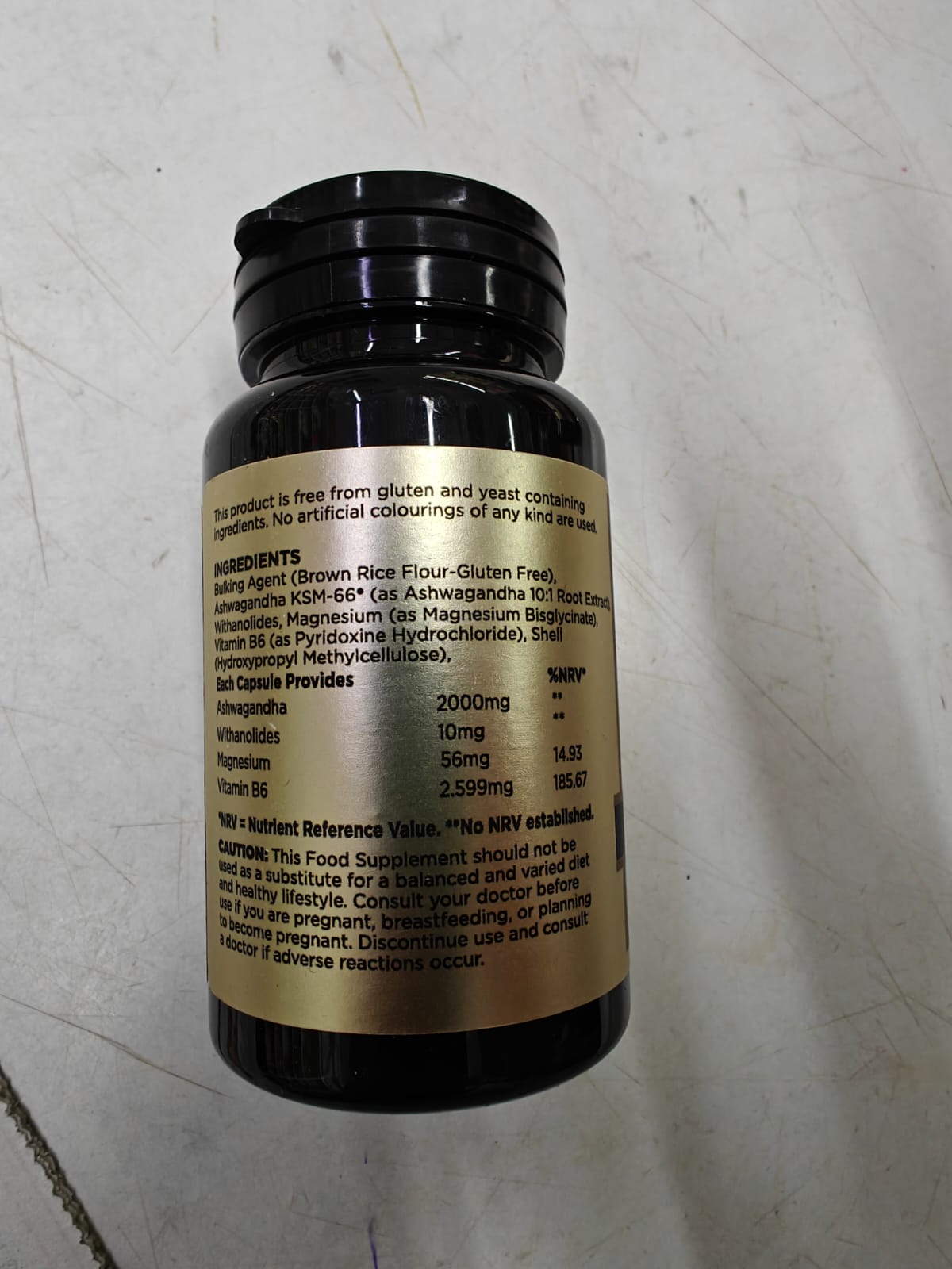 Bulking Agent (Brown Rice Flour-Gluten Free), Ashwagandha KSM-66 (as Ashwagandha 10:1 Root Extract), Withanolides, Magnesium (as Magnesium Bisglycinate), Vitamin B6 (as Pyridoxine Hydrochloride), Shell (Hydroxypropyl Methylcellulose).
