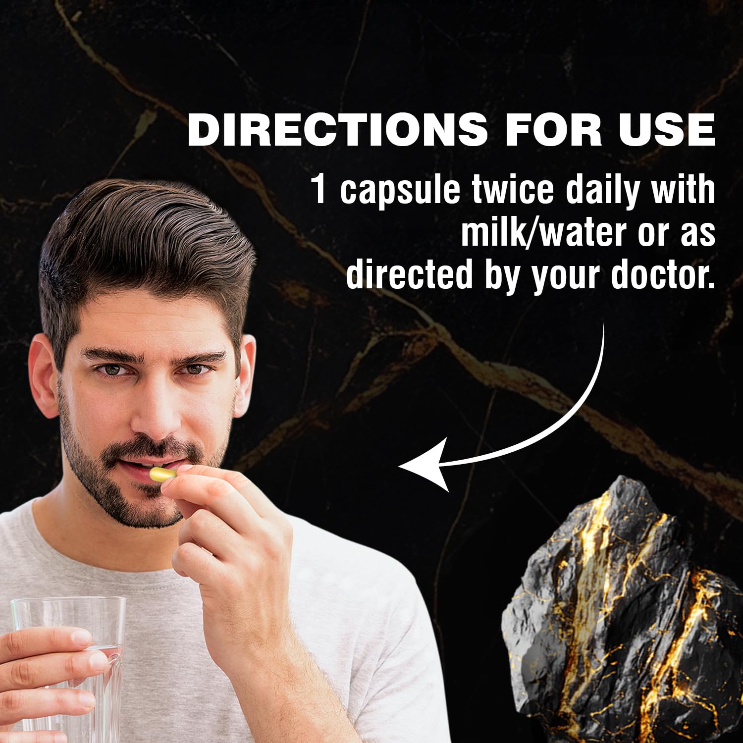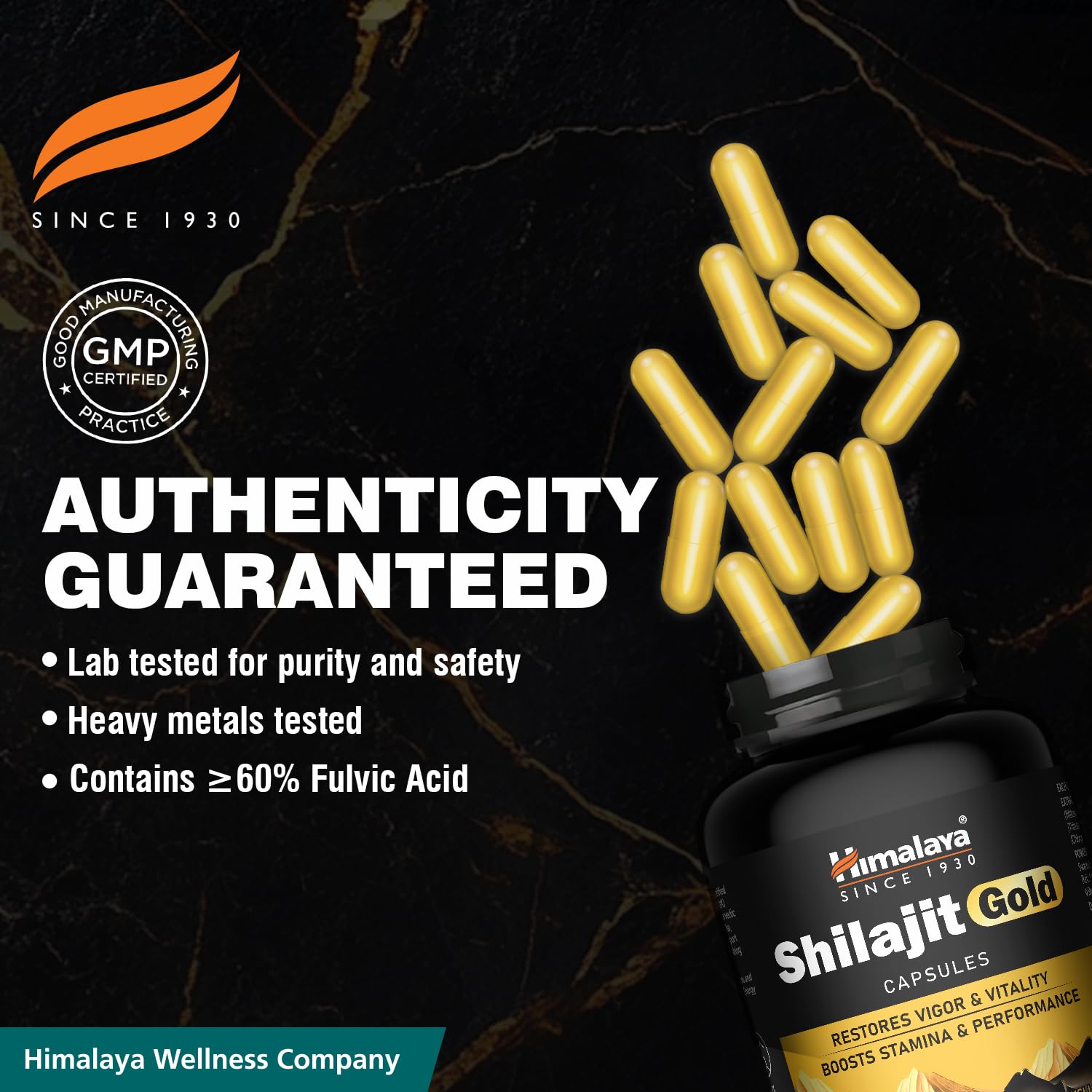 Himalaya Shilajit Gold Capsules are made with a multi-ingredient formula combining the benefit of Shilajit with Swarna Bhasma and unique herbs, which are recommended to improve vigor and vitality, boost strength, and support men’s health. Himalaya Shilajit Gold Capsules contain 100% Pure Himalayan Shilajit purified through the traditional Agnitapi method, which is rich in Fulvic Acid (≥60%) and lab-tested for purity.