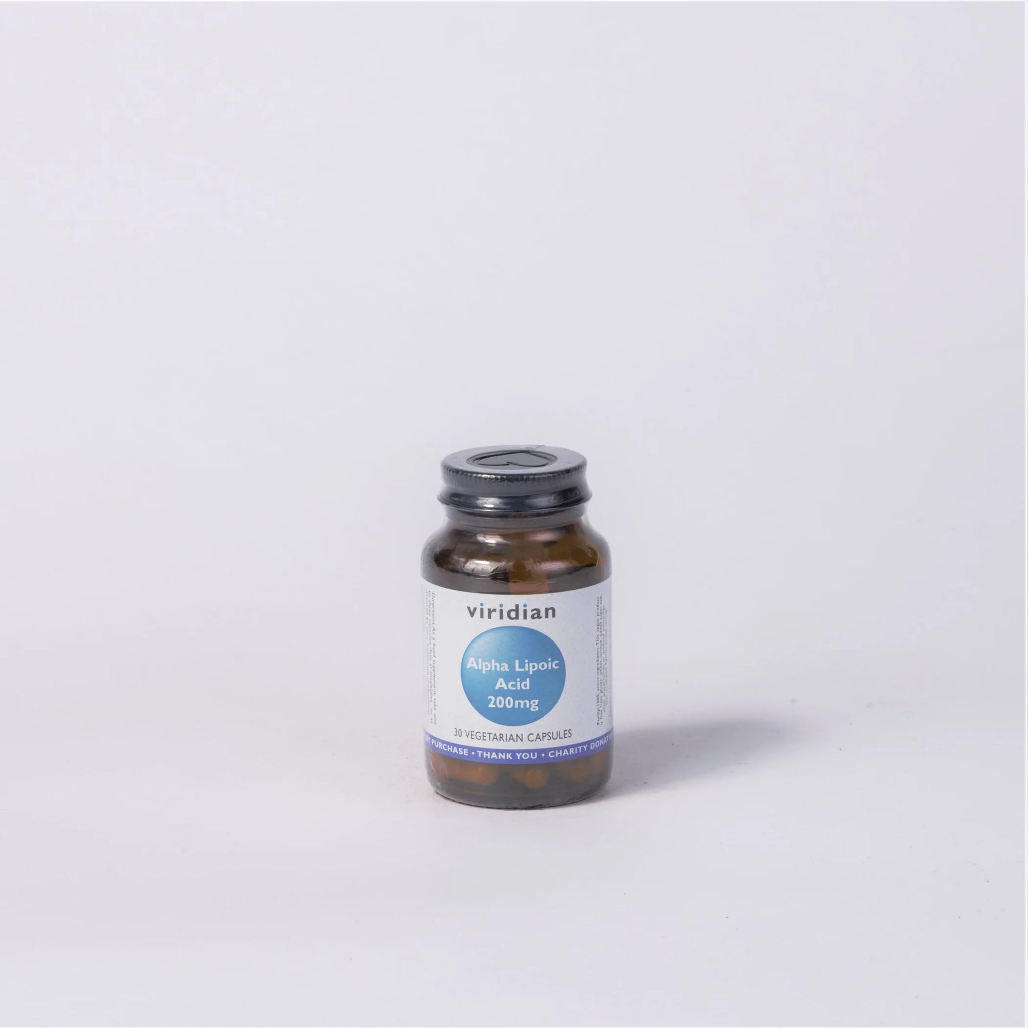 Viridian Alpha Lipoic Acid (ALA) capsules provide a potent, water- and fat-soluble antioxidant (typically 200mg per capsule) that supports cellular energy production, blood sugar balance, and nerve health. It helps regenerate other antioxidants like Vitamin C and E, reduces inflammation, and protects against oxidative stress