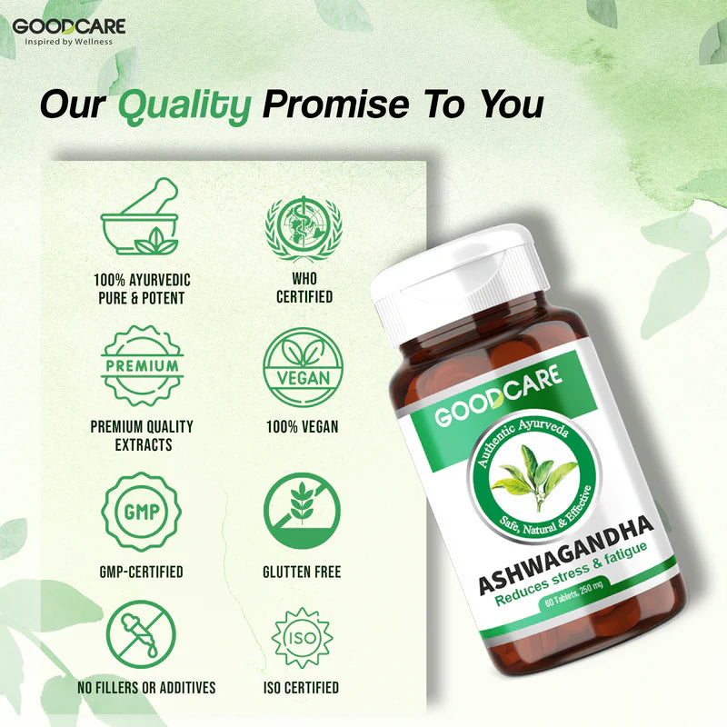 Goodcare Ashwagandha tablet is a powerful single-herb supplement to help you manage your daily stress & fatigue. With the anti-inflammatory and anti-stress properties of Ashwagandha, it helps calm your mind, relax your body and fight tiredness. Additionally, it also supports sound sleep, helps boost immunity & stamina.