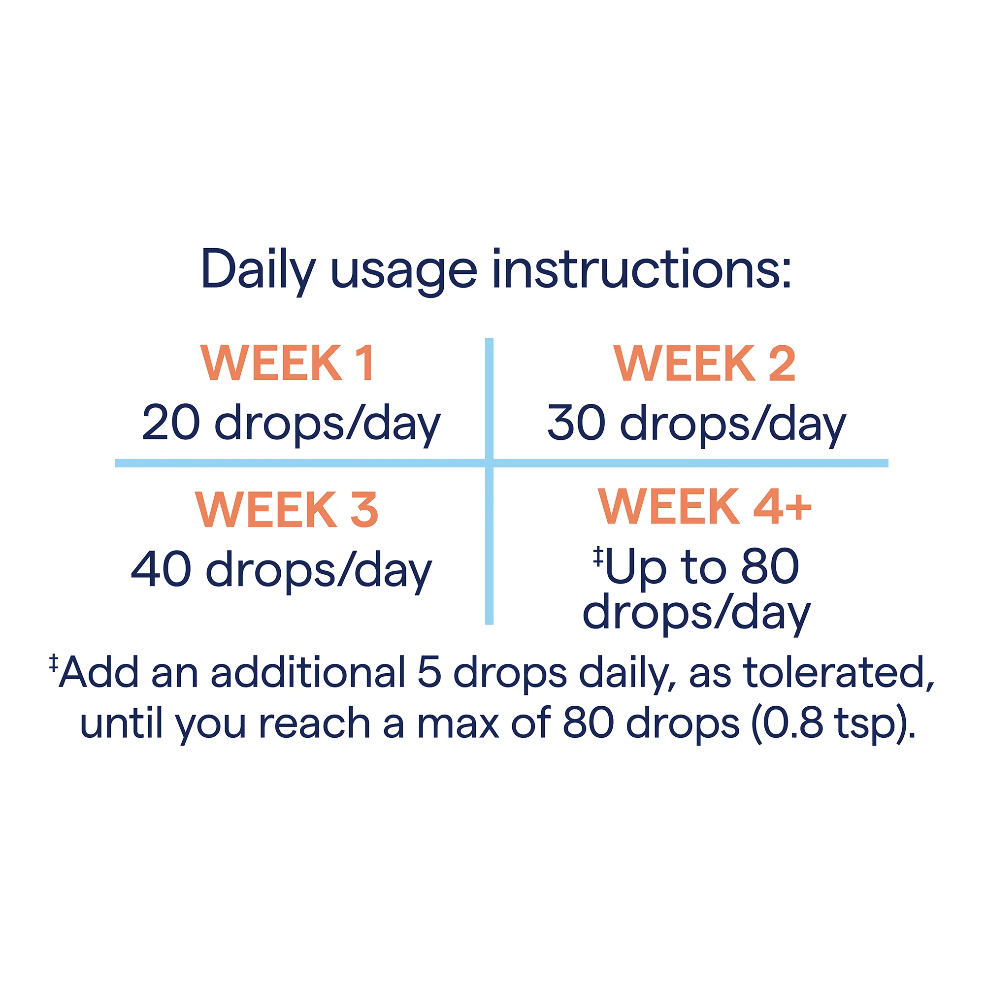 Take 4mL (0.8 tsp; 80 drops) daily. Follow the daily usage chart above if it is your first time taking Ionic Magnesium. Mix the drops into your beverage of choice at mealtimes. A high intake of magnesium may cause a laxative effect. If this occurs, simply reduce the amount per serving. Do not refrigerate.