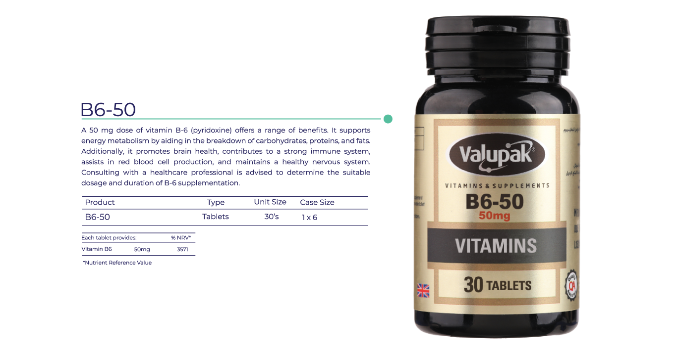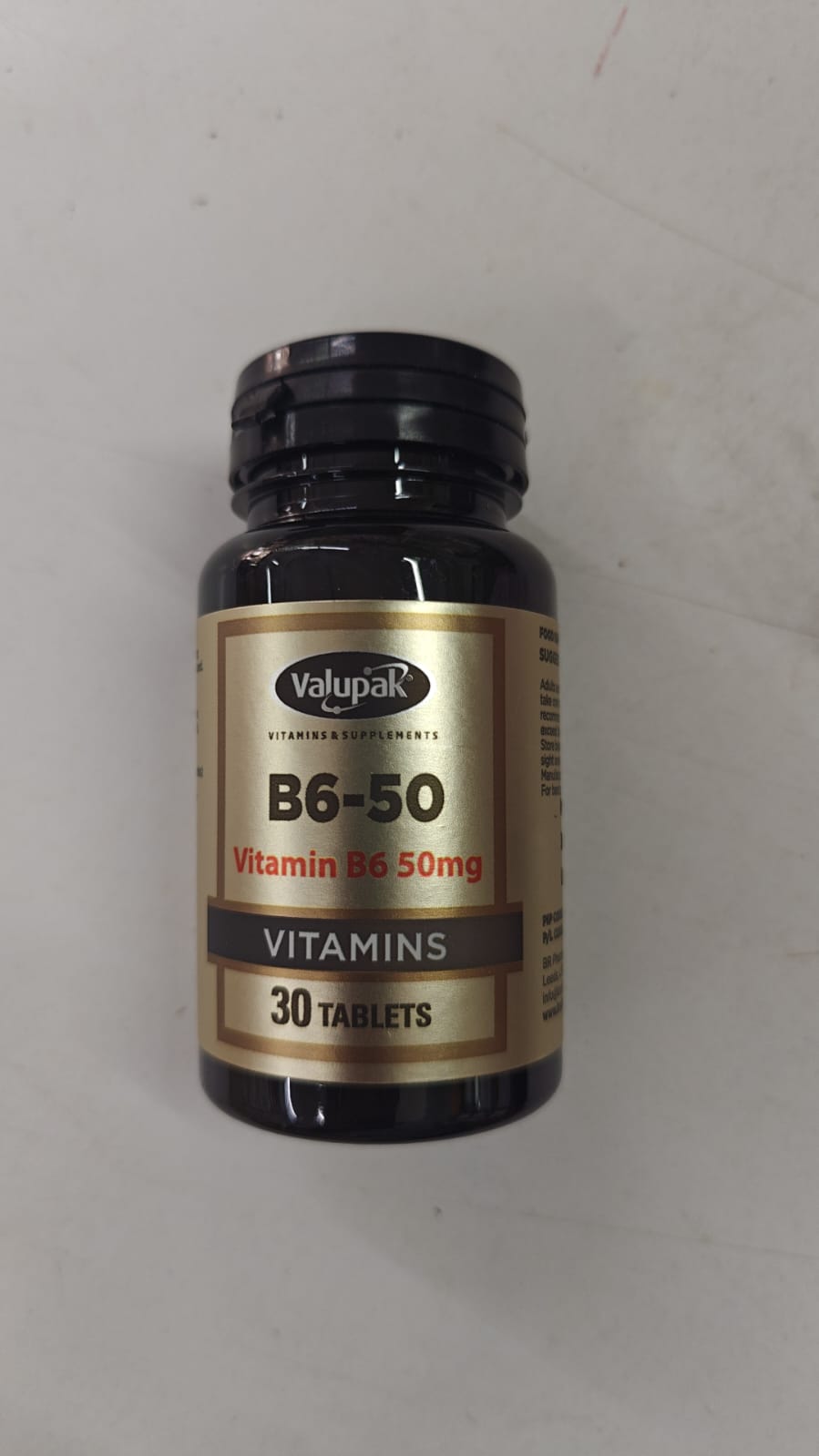 Valupak B6-50 Tablets contain 50mg of vitamin B6 to support energy metabolism by aiding in the breakdown of carbohydrates, proteins and fats. It also promotes brain health, contributes to a healthy immune syttem, assists in red cell production and helps maintain a healthy nervous system.